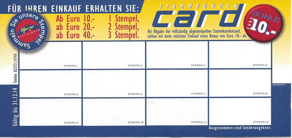 Sammeln Sie bei jedem Einkauf Stempel auf Ihrer Stammkunden-Card. Sobald der Pass voll ist, profitieren sie von € 10,- Bonus.